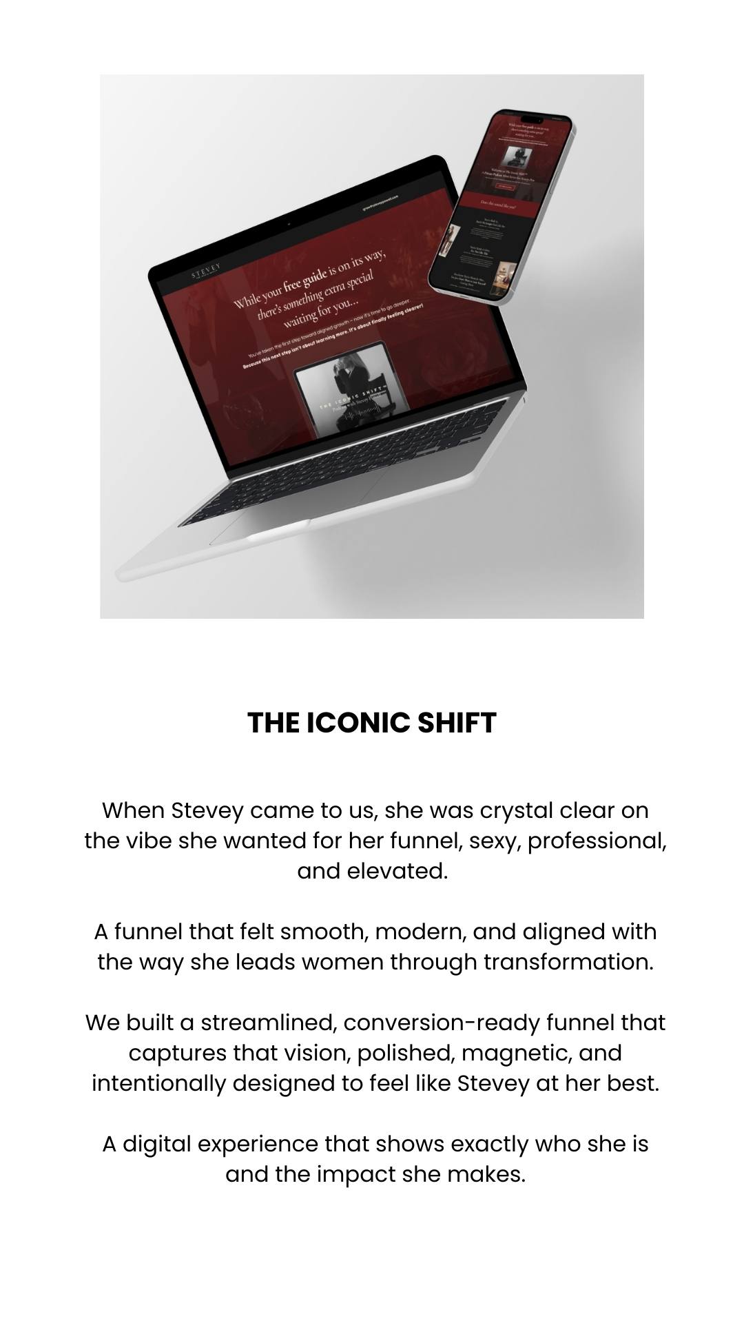 Our boutique design studio specializes in crafting modern, intentional websites that make your value unmistakable and conversion-led funnels that guide your audience with clarity and carry your brand and business forward.