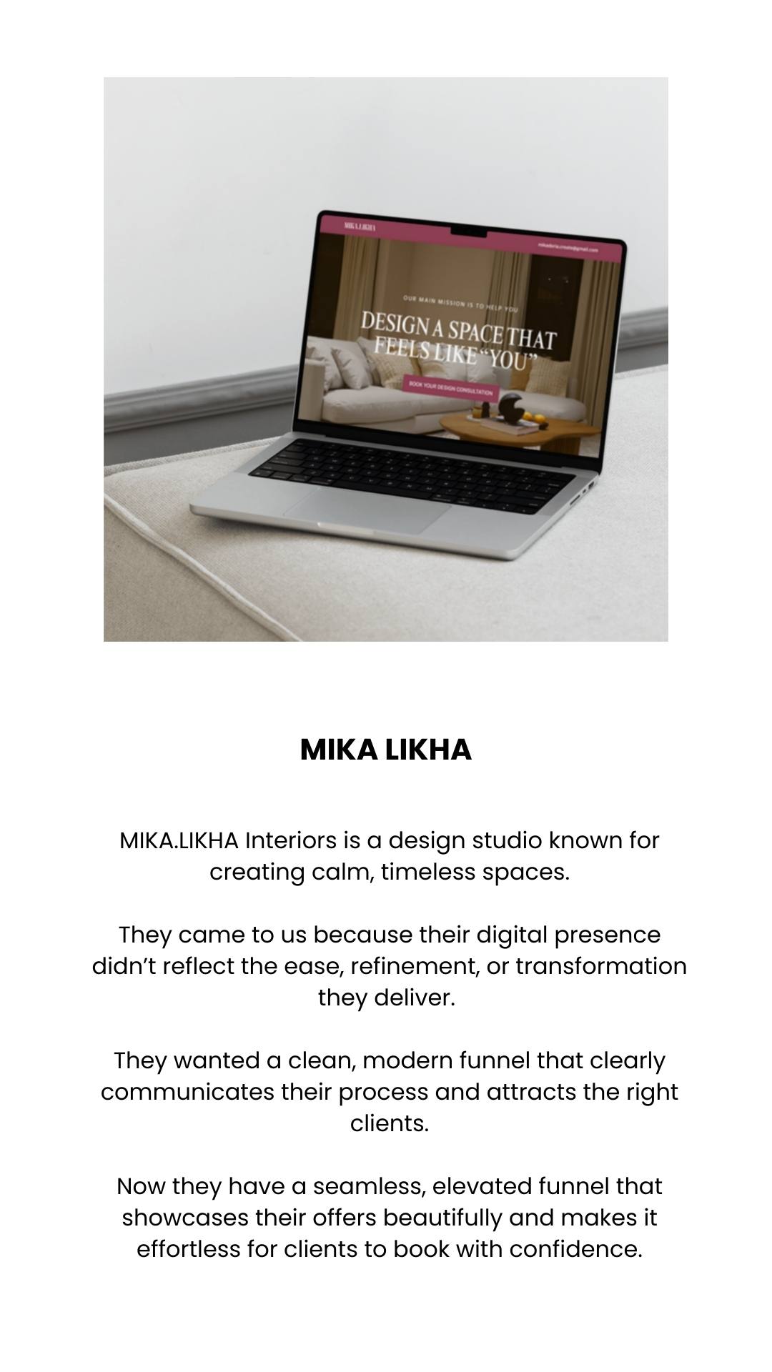 Our boutique design studio specializes in crafting modern, intentional websites that make your value unmistakable and conversion-led funnels for beauty, Interior design and real-estate businesses.